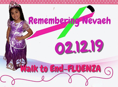 The walk to End-FLUenza is one of the organization’s major fundraising events. To register visit www.walktoendfluenza.com/nevaeh.
