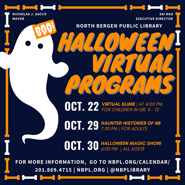 Posted October 16, 2020The North Bergen Free Public Library has arranged three spooktacular virtual programs for the Halloween season. Register for any of the following programs at nbpl.org/calendar.