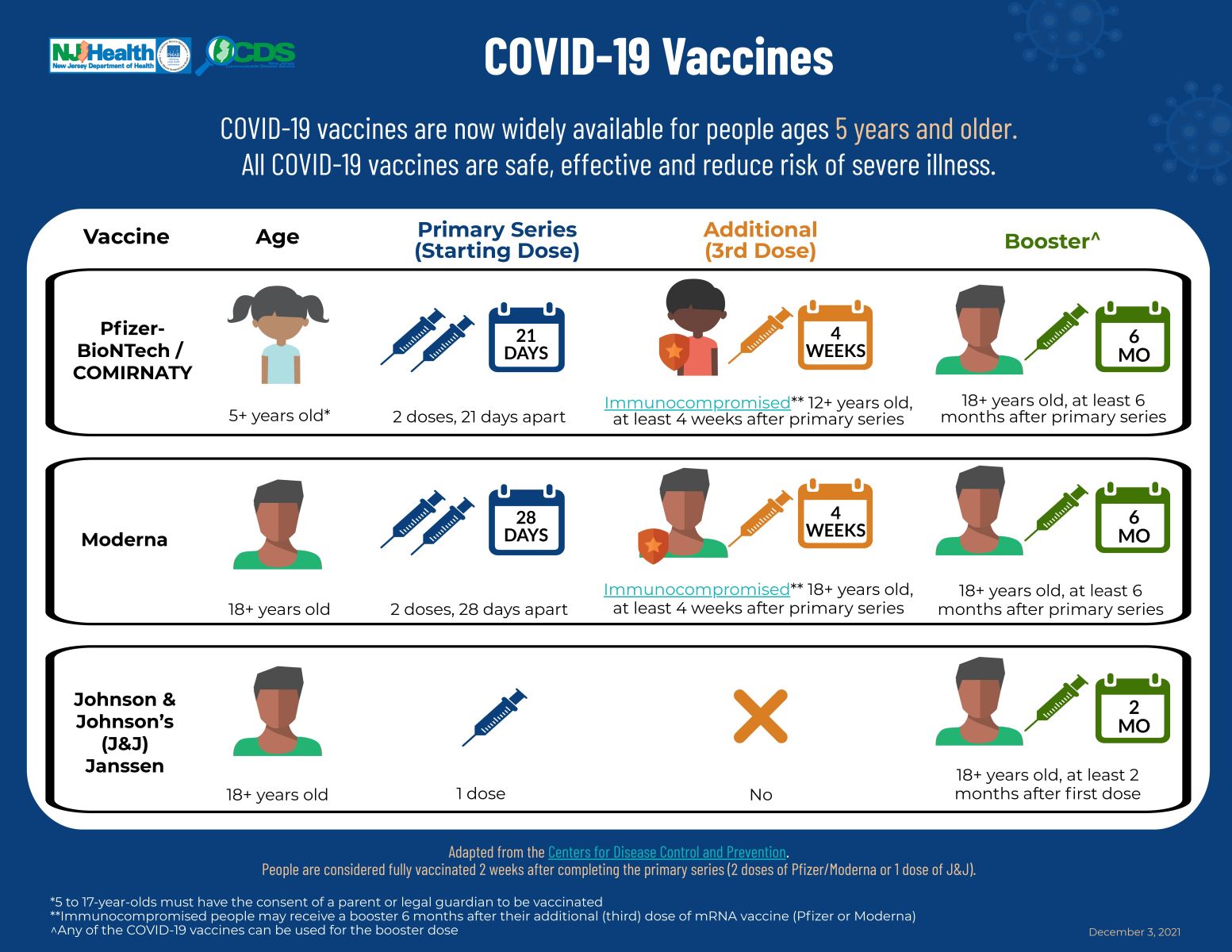 Posted December 08, 2021The New Jersey Department of Health is advising all eligible individuals to get a COVID-19 booster shot. COVID-19 vaccines are now widely available for people ages 5 years and older. All COVID-19 vaccines are safe, effective and reduce risk of severe illness.