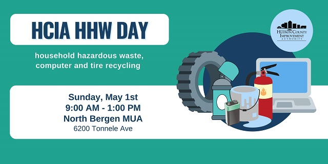 Posted April 29, 2022Local residents are invited to properly discard old electronics, tires, and household hazardous waste at the Hudson County Improvement Authority’s upcoming collection day on May 1. The event will take place from 9 a.m. to 1 p.m. at the North Bergen MUA, 6200 Tonnelle Ave.