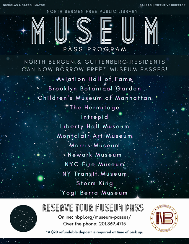 Posted July 29, 2022Guttenberg and North Bergen residents with an unexpired adult library card in good standing (no fines or overdue items) can reserve a museum pass.