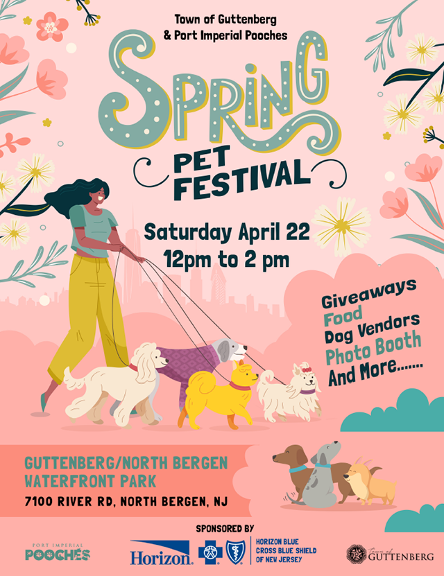 Posted April 19, 2023The Town of Guttenberg and Port Imperial Pooches are proud to present the Spring Pet Festival from noon to 2 p.m. in Waterfront Park, 7100 River Road. In addition to the parade of pets, there will be giveaways, food, dog vendor, a photo booth, and more.