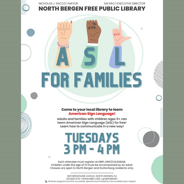 Posted July 07, 2023Adults and families with children ages 5+ can learn American Sign Language (ASL) for free at the North Bergen Public Library. Learn how to communicate in a new way on Tuesdays at 3 p.m. at the main branch, 8411 Bergenline Ave.