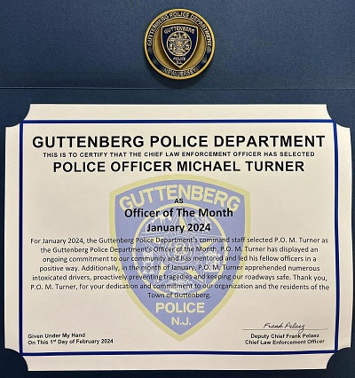 Posted February 02, 2024The Guttenberg Police Department’s command staff has selected Police Officer Michael Turner as the Guttenberg Police Department’s Officer of the Month for January 2024.