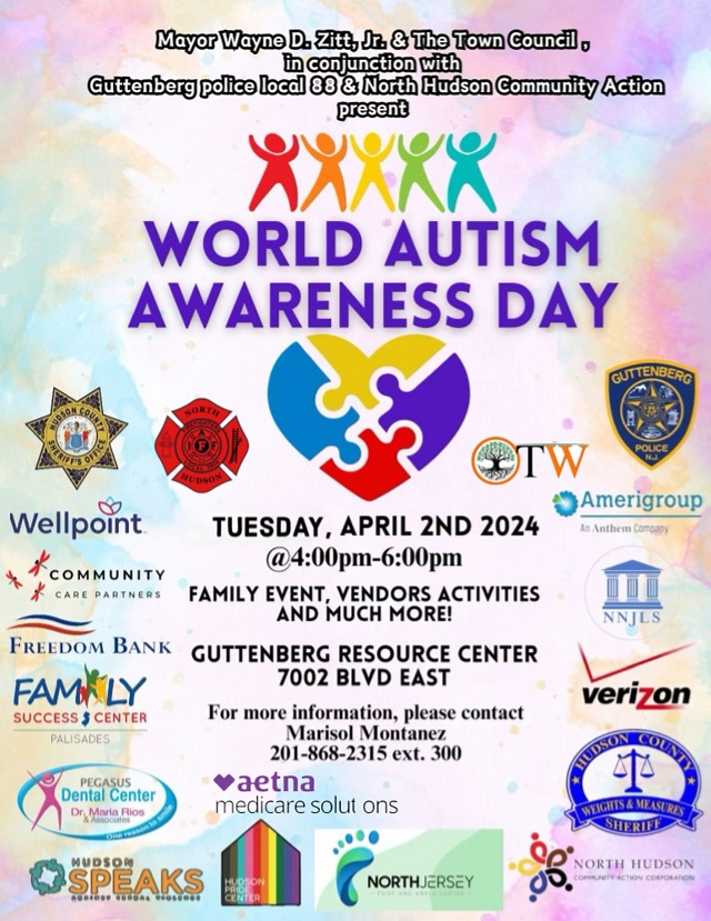 Guttenberg is doing its part by holding a big Autism Awareness event at the Guttenberg Resource Center from 4 to 6 this afternoon. Everyone is invited to attend this family-friendly activity, featuring nearly 20 vendors offering activities, information, giveaways, and more.
