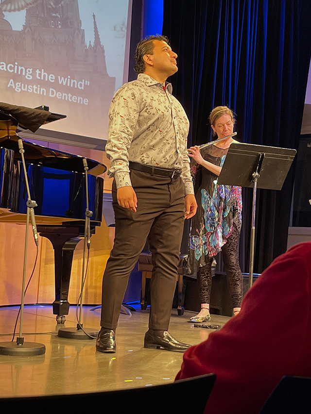 Best of all, the star was Guttenberg’s own Oswaldo Iraheta, a Galaxy Towers resident. As described in the program notes, “With ancestral voices from his indigenous roots, tenor Oswaldo Iraheta guides us to the heart of Argentina and El Salvador, through the arduous journey of crossing the Rio Grande.”