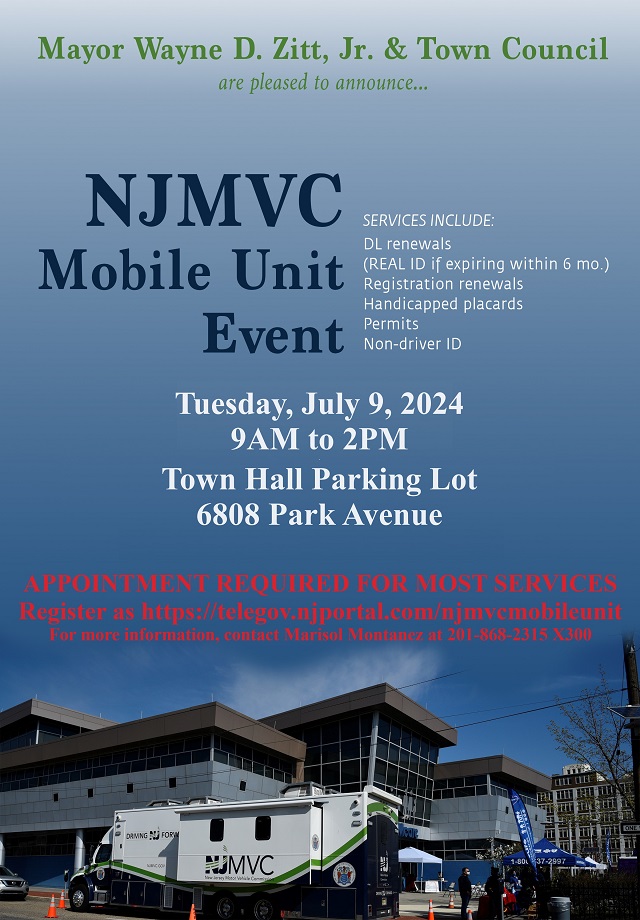 Posted July 05, 2024For the convenience of residents, the New Jersey Motor Vehicle Commission is bringing their mobile unit to Guttenberg for one day only on Tuesday, Jul. 9. They will be located in the Town Hall parking lot at 6808 Park Avenue from 9 a.m. to 2 p.m.