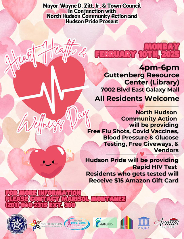 Posted February 06, 2025The Town of Guttenberg is holding a Wellness Event on Monday, Feb. 10, 2025. North Hudson Community Action Corporation (NHCAC) will be on hand to offer free flu shots, Covid vaccines, blood pressure and glucose testing, and giveaways to attendees.