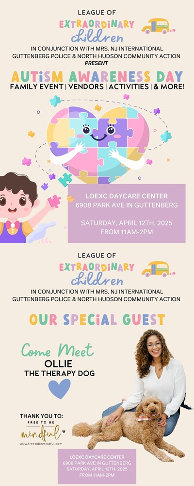 Posted April 10, 2025Guttenberg’s League of Extraordinary Children is partnering with Mrs. NJ International, the Guttenberg Police Department, and North Hudson Community Action Corporation for a fun and meaningful Autism Awareness Day family event on Saturday, Apr. 12 from 11 a.m. to 2 p.m.