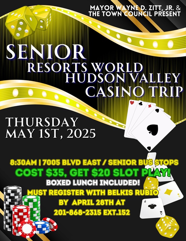 Posted April 25, 2025Mayor Wayne Zitt and the Guttenberg Town Council invite all senior citizens to join a free trip to Resorts World Hudson Valley Casino on Thursday, May 1.