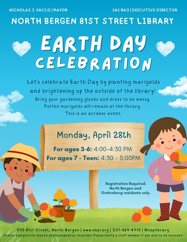 The North Bergen Free Public Library is celebrating Earth Day with an event on Monday, Apr. 28 at the 81st Street Branch. Join them to plant marigolds and brighten up the outside of the building at 510 81st Street. There will be two sessions: