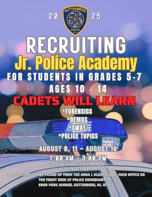 Posted May 23, 2025Guttenberg’s Junior Police Academy is a tremendously popular summer activity for kids entering grades 5 through 7 (ages 10-14). Applications are available now to participate in this great program and get a taste of real law enforcement training this summer.