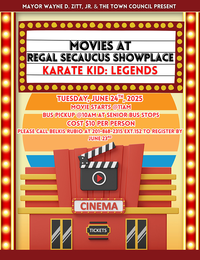 Posted June 19, 2025Mayor Wayne Zitt and the Town Council invite Guttenberg seniors to enjoy a monthly trip to the Regal Showplace Theatre in Secaucus. This month’s movie is “Karate Kid: Legends” on Tuesday, Jun. 24, 2025.
