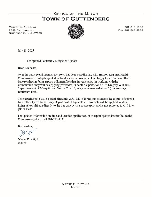 “Over the past several months, the Town has been coordinating with Hudson Regional Health Commission to mitigate spotted lanternflies within our area. I am happy to see that our efforts have resulted in fewer reports of lanternflies than in years past. In working with the Commission, they will be applying pesticides, under the supervision of Dr. Gregory Williams, Superintendent of Mosquito and Vector Control, using an unmanned aircraft (drone) along Boulevard East.