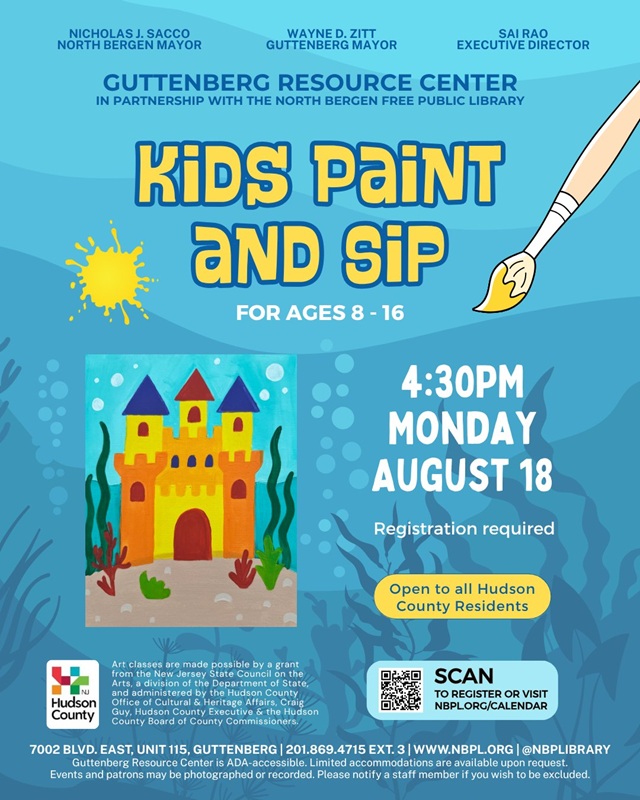 Posted August 15, 2025The North Bergen Free Public Library invites youths ages 8 to 16 to a fun-filled paint & sip afternoon. Paint a spectacular underwater scene while you sip on some refreshing juice at the Guttenberg Resource Center.