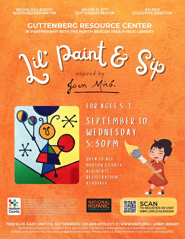 Posted September 08, 2025The North Bergen Free Public Library is hosting a “Lil’ Paint & Sip” event inspired by the art of Joan Miró. The event for children ages 5-7 will take place at 5:30 p.m. on Wednesday, Sep. 10 at the Guttenberg Resource Center inside the Galaxy Towers Mall, 7002 Boulevard East, lower level.