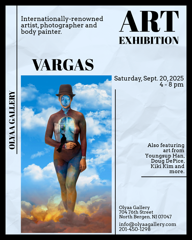 Posted September 18, 2025The public is invited to a free reception for the current exhibition featuring artist Vargas at Olyaa Gallery, 704 76th Street in North Bergen. The reception takes place from 4 to 8 p.m. on Saturday, Sep. 20.