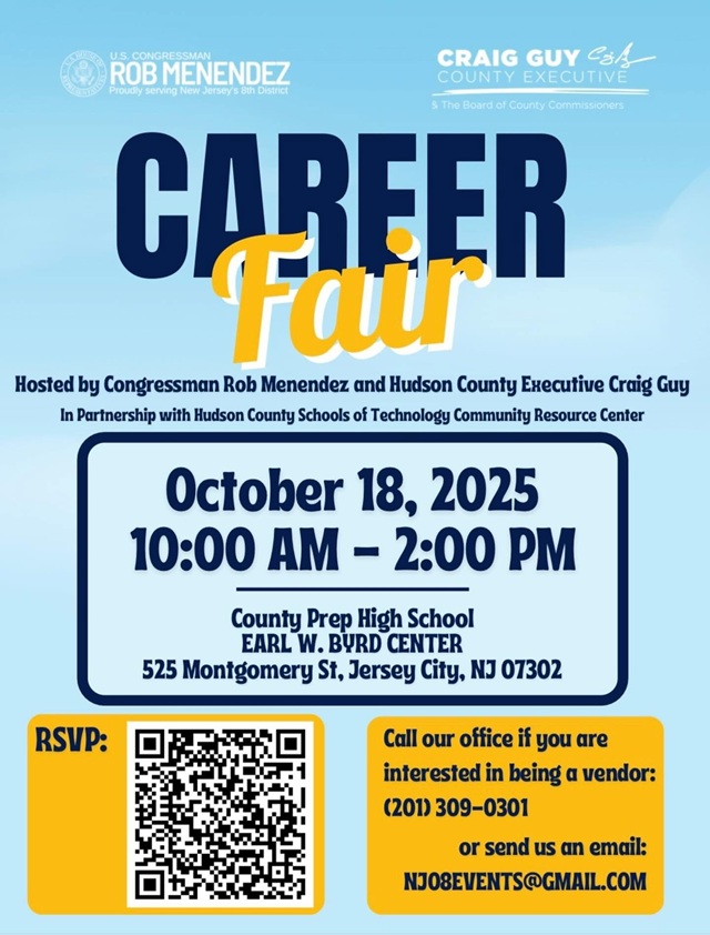 Posted October 16, 2025There will be a career fair from 10 a.m. to 2 p.m. on Saturday, Oct. 18 at County Prep High School Earl W. Byrd Center, 525 Montgomery Street in Jersey City.