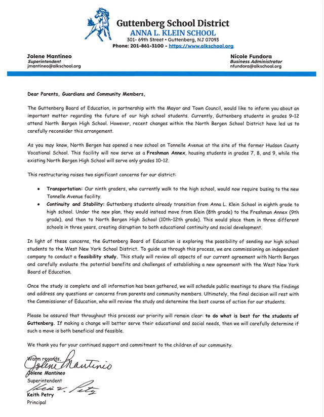 Posted October 17, 2025The Guttenberg School District has posted a letter to residents informing them of potential changes to the scholastic arrangement for students graduating from Anna L. Klein School.