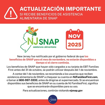 Posted October 28, 2025New Jersey was notified by the federal government that if the government shutdown continues, November 2025 Supplemental Nutrition Assistance Program (SNAP) benefits will not be available on time.