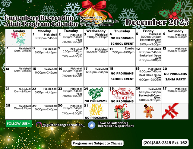 Posted December 01, 2025The December Recreation calendar is now online. Click on the link below for a comprehensive listing of all the great activities sponsored by Guttenberg Recreation this month for both kids and adults.