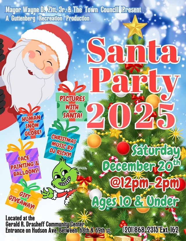 Posted December 18, 2025Guttenberg’s annual Holiday Celebration for kids in grades pre-K through 2 is returning to the Gerald R. Drasheff Community Center on Saturday, Dec. 20 from noon to 2 p.m. The event will take place in the auditorium on Hudson Avenue between 68th and 69th Streets.