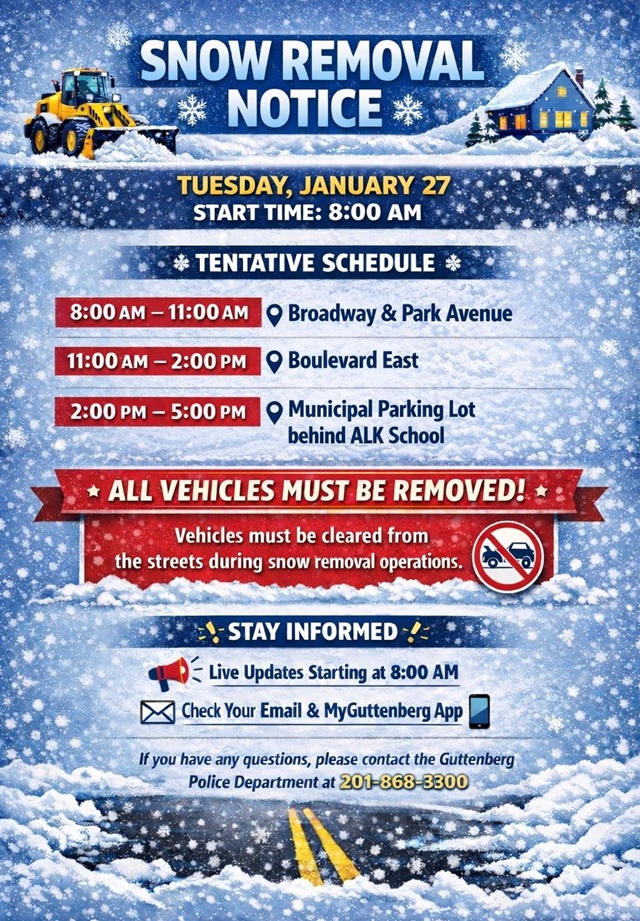 Live updates will be provided throughout the day beginning at 8 a.m. via email and the MyGuttenberg app. Residents are encouraged to monitor these channels for real-time information and any schedule adjustments.