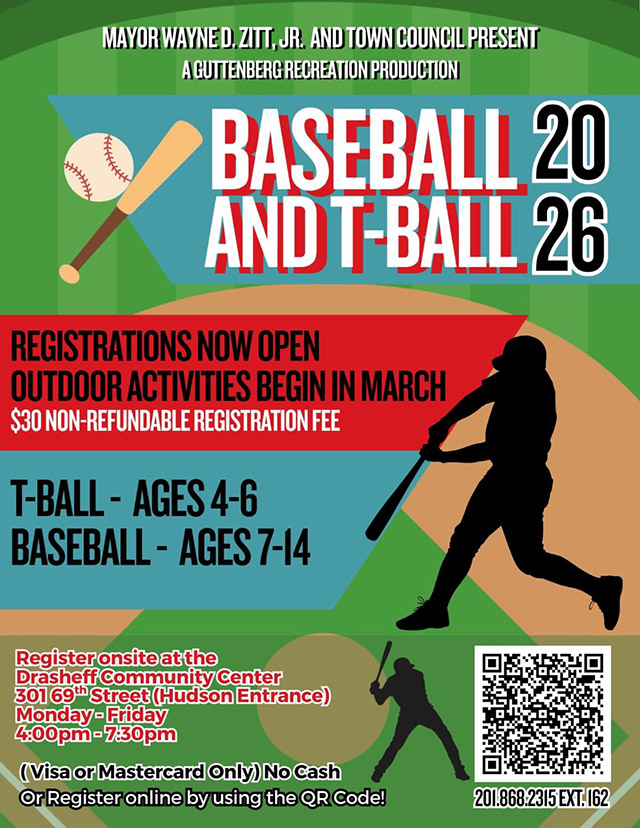 Posted January 30, 2026The Town of Guttenberg Recreation Department, Mayor Wayne Zitt, and the Town Council are pleased to invite Guttenberg residents ages 4 to 6 to register for T-ball, and ages 7 to 14 to register for baseball.