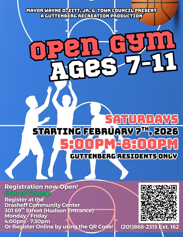 Posted February 03, 2026The Guttenberg Recreation Department in conjunction with Mayor Wayne Zitt and the Town Council invite residents ages 7 to 11 to open gym nights from 5 to 8 p.m. every Saturday at the Gerald R. Drasheff Community Center.