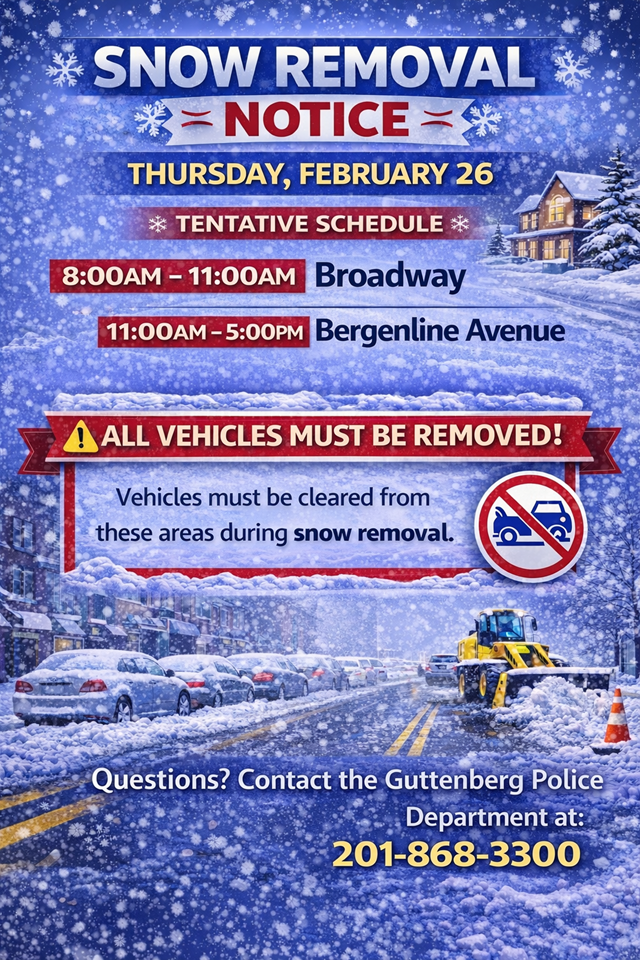 Posted February 26, 2026Snow removal operations will continue on Thursday, Feb. 26 beginning at 8 a.m. for the remainder of Broadway and then move to Bergenline Avenue beginning at approximately 11 a.m.